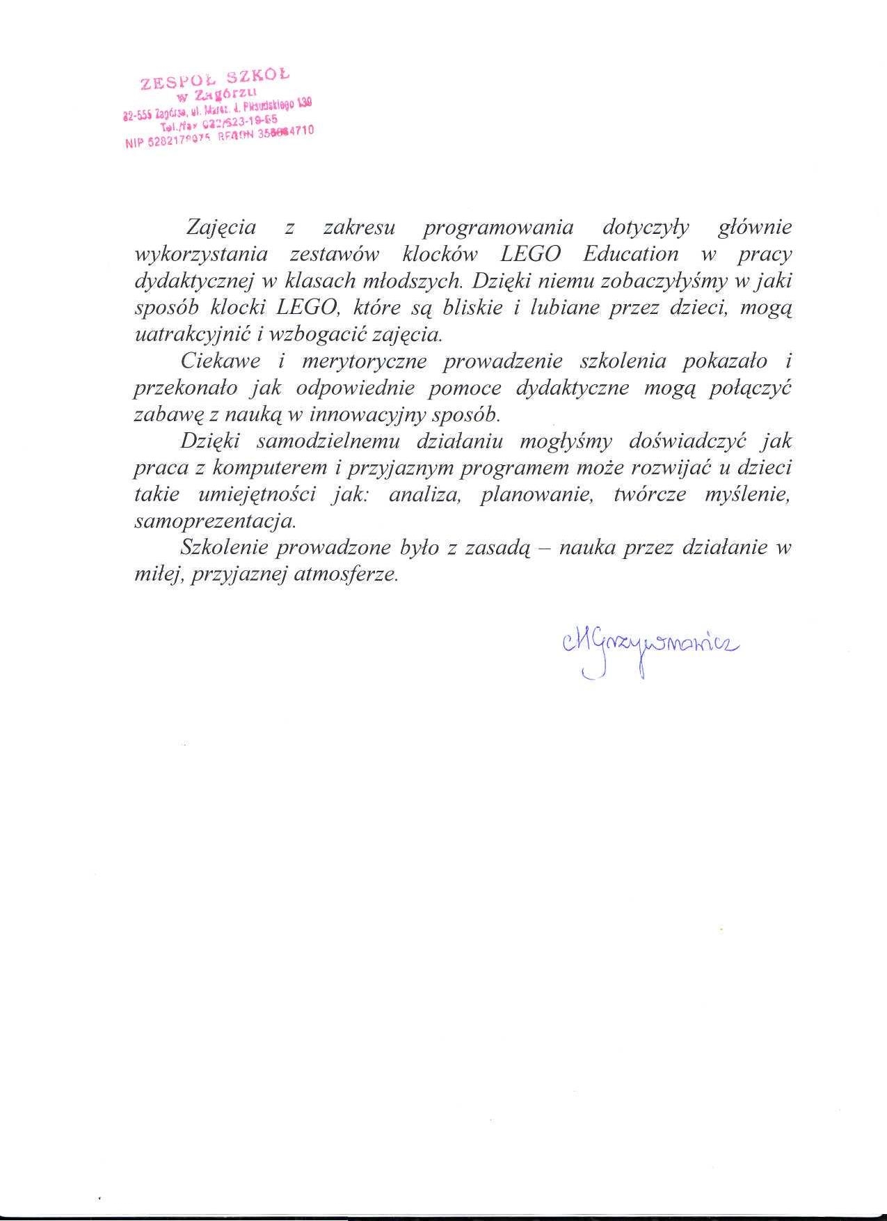 • Szkolenie super,prowadzący również. Najważniejszą zaletą szkolenia – według mnie było to, że miało ono formę warsztatową i każdy mógł „się pobawić” 🙂 . Nic gorszego, gdyby się okazało, że zestaw szkoleniowy np. jeden czy dwa, a reszta patrzy i nic … Ja jestem raczej osobą a-techniczną, raczej nie interesują mnie takie rzeczy, a tu proszę nawet ktoś taki został porwany do zabawy i zaciekawiony. Jak widać wszystko zależy od doboru właściwej osoby prowadzącej i metody pracy. Szczerze mówiąc chętnie pobawiłabym się jeszcze, a wykorzystanie tego na zajęciach z dziećmi to już szczyt marzeń – a może nie 🙂  Myślę, że dzieci szybciej załapią robotykę niż nauczyciele i to my będziemy mogli wiele nauczyć się od nich, co też dodatkowo dzieciaki zmotywuje i podbuduję. Role się odwrócą…